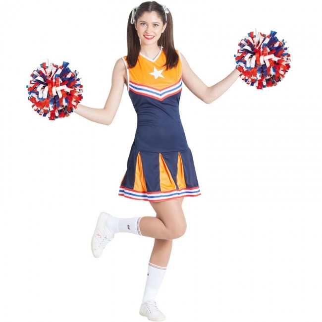 El disfraz de animadora para mujer incluye el vestido. Con el disfraz de animadora para adulta en color naranja y azul tendrás el vestido perfecto para disfrazarte como una auténtica cheerleader de un equipo deportivo, y triunfarás en tu fiesta de disfraces.