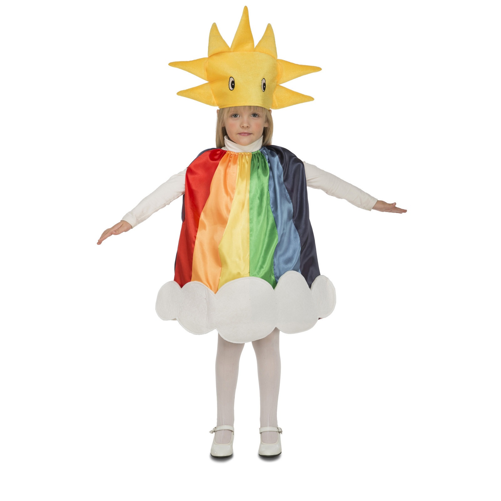 El disfraz de arco iris infantil incluye sombrero y vestido. Este disfraz es perfecto para las fiestas o teatros infantiles con temática de las estaciones del año, el tiempo, etc…