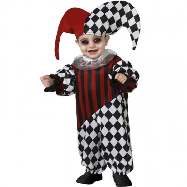 El disfraz Halloween de Arlequín oscuro para bebés incluye: vestido y gorro. Este traje aterrador de bebé imitando a un bufón malvado está disponible en 3 tallas distintas.