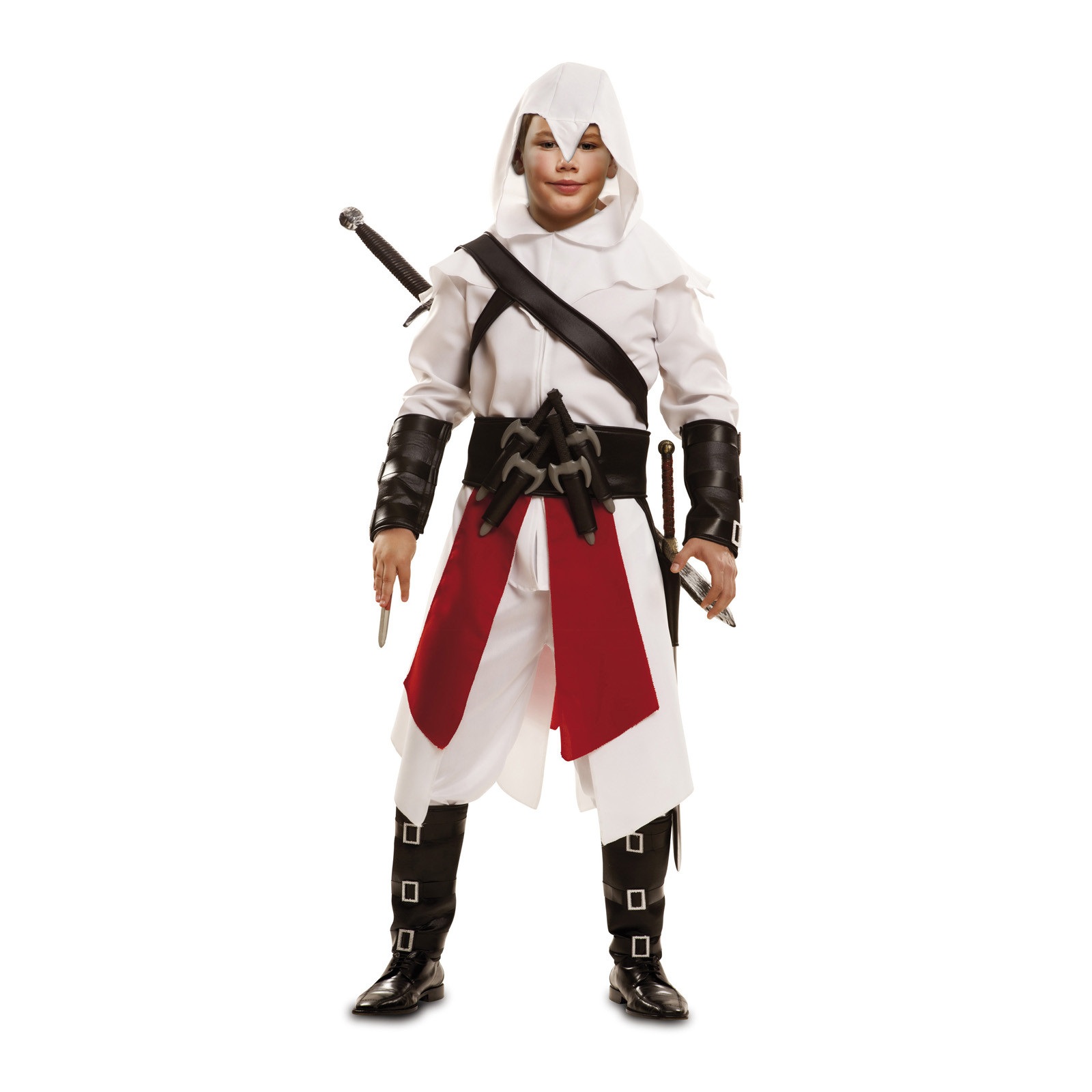 El disfraz de asesino blanco para niño incluye capucha, camisa, pantalón, faldón, bandolera, cinturón, brazaletes y espinilleras. Este disfraz de Mercenario es perfecto para imitar al personaje de Assassin’s Creed Ezio Auditore.