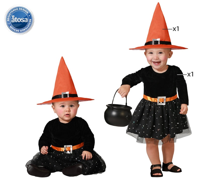 El disfraz de bruja bebé naranja para niña incluye sombrero y vestido.