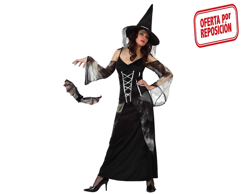 El disfraz de bruja negro para mujer incluye sombrero y vestido.
