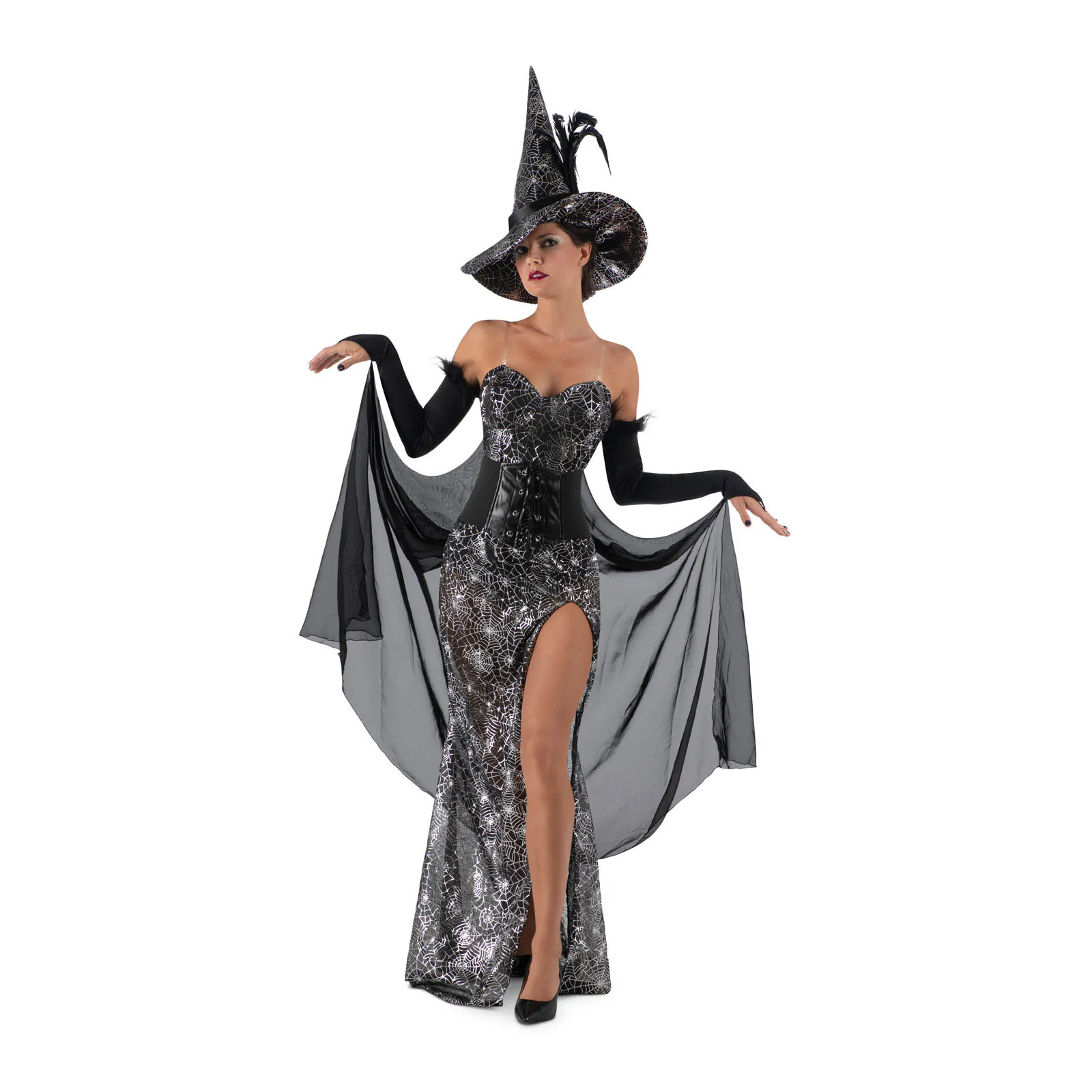 El disfraz de bruja telaraña para mujer incluye SOMBRERO, VESTIDO CON BODY, TIRANTES, CORPIÑO Y CAPA CON MITONES.