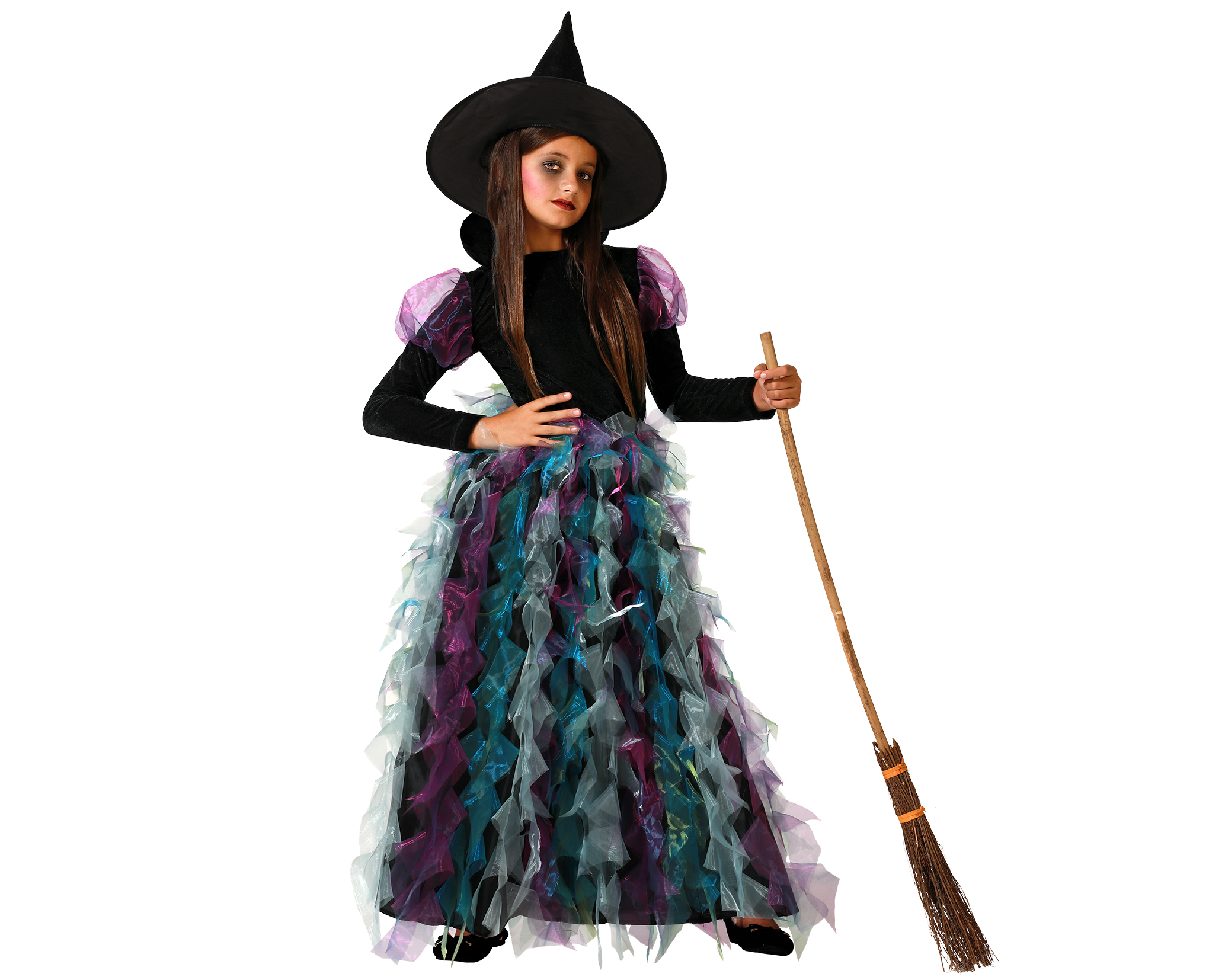 El disfraz de bruja verde para niña incluye vestido y sombrero.