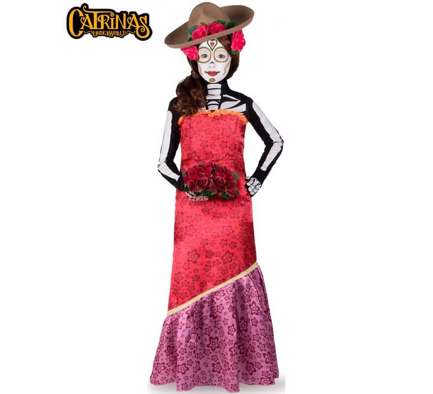 Disfraz de Catrina Cassandra para mujer. Incluye camiseta esqueleto de manga larga, guantes, vestido, sombrero, peluca, tattoo y esponja con pastilla blanca. No incluye ramo ni calzado. Este producto es de licencia oficial de Catrinas Underworld. Ideal para Halloween y fiestas de terror.