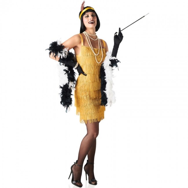 El disfraz de charlestón con flecos dorados para mujer incluye Vestido, Diadema con pluma. Disfraz típico de los años 20 en color dorado que imita los vestidos que utilizaban las mujeres para bailar el Charlestón, un baile que hizo furor en Europa y Estados Unidos a principios del siglo XX.