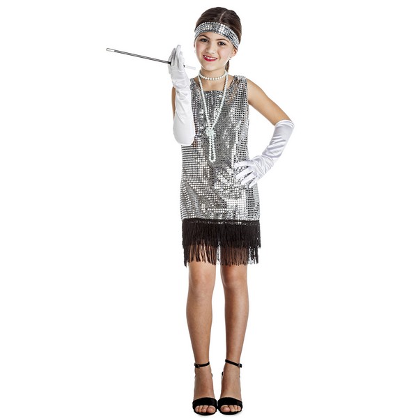 El disfraz de charlestón plateado para niña incluye vestido y cinta para la cabeza.El disfraz de charleston plata para niña incluye vestido y tocado. Deja que tu peque reviva todo el color de los mejores años 20 con nuestro disfraz de cabaret para niña.