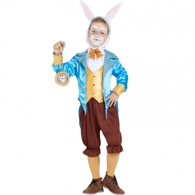 El disfraz de conejo de Alicia en el país de las maravillas para niño incluye cabeza con orejas, chaqueta, chaleco con camisa, pajarita y pantalones. Modelo infantil que nos recuerda al conejo blanco de la película de animación de Alicia en el país de las maravillas.