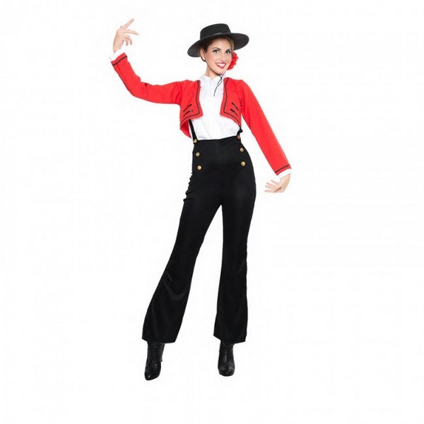 El disfraz de cordobesa para mujer incluye camisa, chaqueta y pantalón con tirantes. Elegante Disfraz de Cordobesa para carnaval. Este bello disfraz negro estiliza y realza enormente la figura de nuestra bella cordobesa.  Da ese toque torero al conjunto, que se completa con un negro sombrero cordobés con flor.