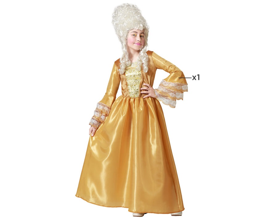 El disfraz de cortesana dorado para niña incluye vestido manga larga. Magnífico disfraz de cortesana en color dorado que te permitirá encarnar a estas figuras de la realeza, convertirte en María Antonieta o conseguir un ‘look’ muy veneciano para carnavales, despedidas y otras ocasiones especiales.