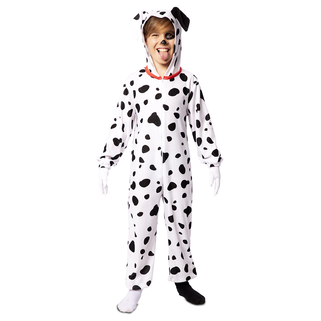 El disfraz de dálmata unisex infantil incluye mono con capucha. Con el disfraz de dálmata para niño o niña tendrás el traje perfecto para disfrazar a tus hijos como estos simpáticos perros blancos con manchas negras famosos por la película 101 Dálmatas de Disney y serán los niños más guapos y simpáticos de la fiesta de disfraces.