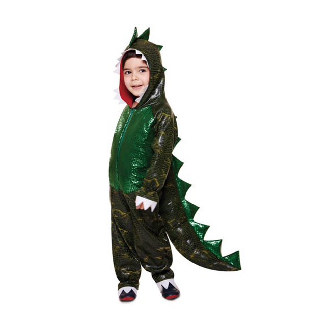 El disfraz de dinosaurio infantil incluye mono con capucha y cola. Un vistoso y original traje de Dinosaurio en color verde para las fiestas y eventos disfrazados de tus hijos.