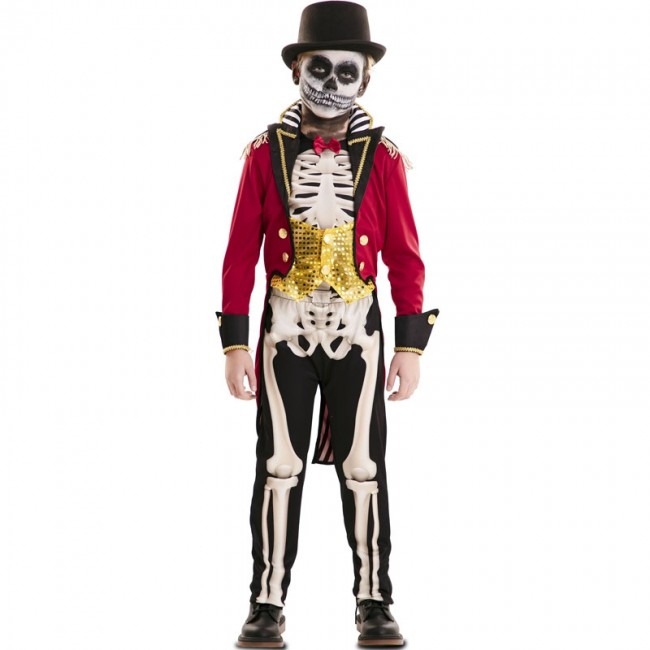 El disfraz Halloween de Domador Esqueleto para niños incluye: chaqueta con camisa y chaleco simulado, pantalón. Este traje es un aterrador disfraz de niño imitando a un presentador de circo esqueleto.