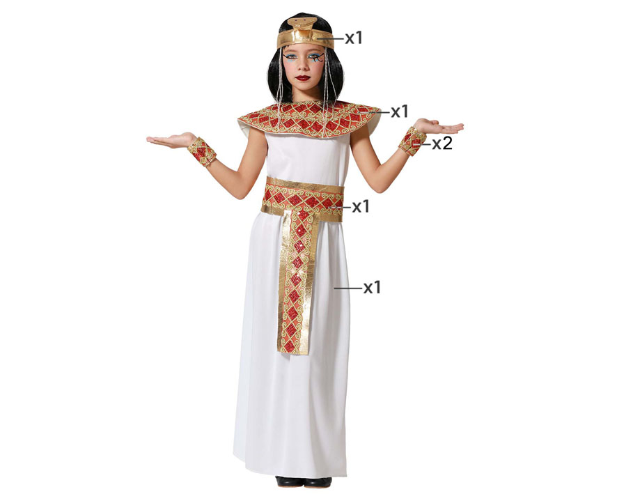 El disfraz de egipcia para niña incluye 1 diadema, 1 vestido, 1 cuello, 2 brazaletes y 1 cinturón. Disfraz de Egipcia Kama para niña para carnaval y fiesta de disfraces. Haz un recorrido por los distintos países y culturas con nuestros disfraces.