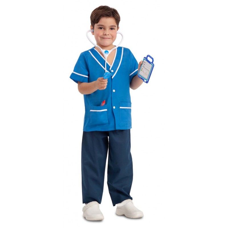 El disfraz de enfermero infantil incluye camisa, pantalones, fonendoscopio, tarjeta de identificación, ficha médica y jeringuilla.