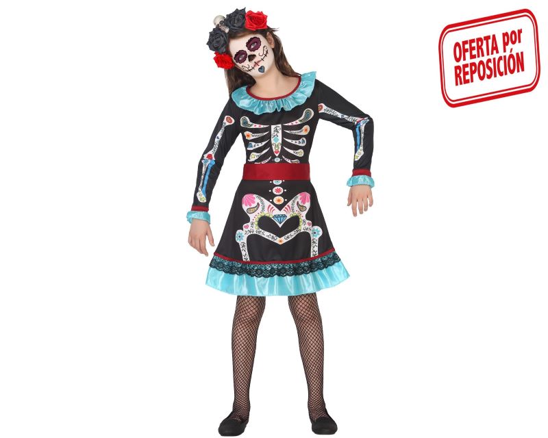 El disfraz de esqueleto colores para niña incluye el vestido y cinturón.