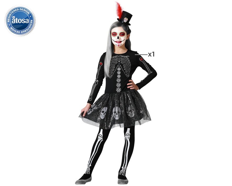 El disfraz de esqueleto falda para niña incluye vestido negro ajustado decorado con un esqueleto y calaveras en la falda brillante y un tejido superpuesto semitransparente.