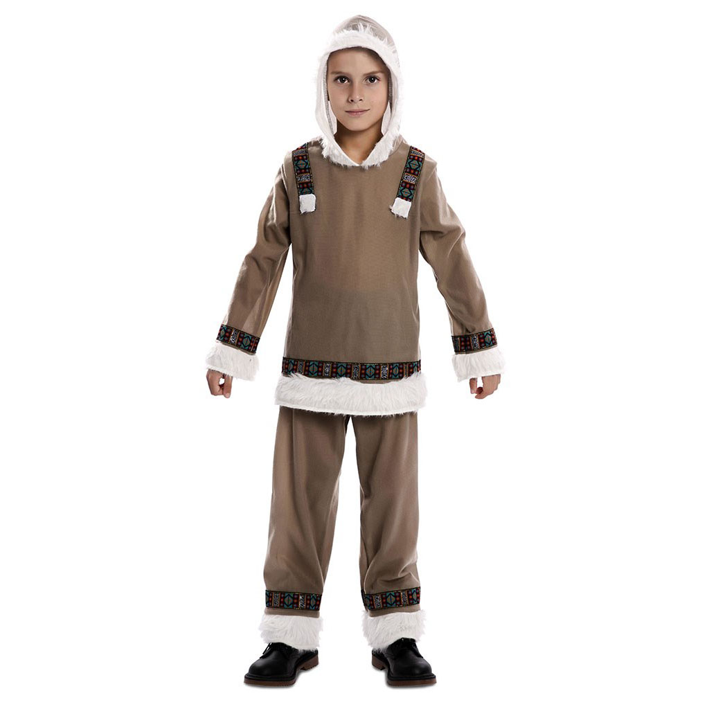El disfraz de esquimal para niño incluye : Jersey con capucha, pantalón. Como si viniera de una larga y dura travesía a través del Polo Norte, abrigadito, y con un aspecto dulce y delicado, es como verás a tu pequeño cuando se ponga este disfraz de esquimal para niño.