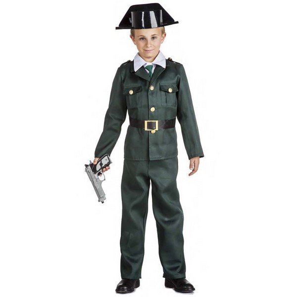 El disfraz de guardia civil para niño incluye chaqueta con cuello y corbata, pantalones, cinturón y sombrero. Este guardia civil es un implacable agente que todos los días pone en peligro su vida velando por la seguridad de los ciudadanos.