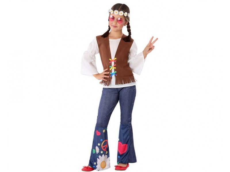 El disfraz de hippie para niña incluye pantalón y camisa con chaleco. Este disfraz para niñas Hippie Girl Love & Peace es el disfraz ideal para las fiestas hippies de los 60.