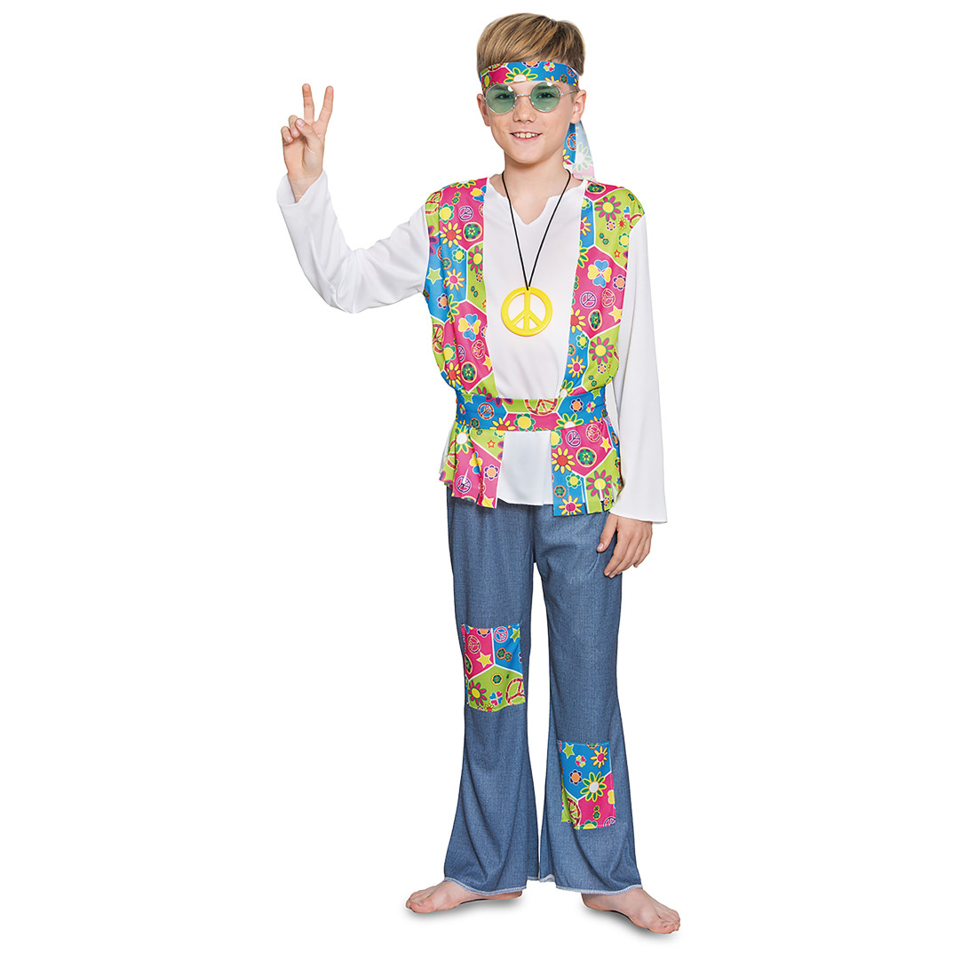 El disfraz de hippie para niño incluye Camisa con chaleco simulado, pantalón, vincha, collar, cinturón. Con el disfraz de hippie años 60 con chaleco para para niño tendrás un traje con un gran diseño y calidad ideal para disfrazar a tu hijo como estos pacifistas de la década de los 60 cuyo lema era «Paz y Amor».