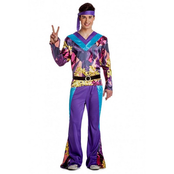 El disfraz de hippie violeta incluye camisa, pantalones, cinturón y cinta para la cabeza. Reparte amor por la fiesta ataviado con este divertido disfraz de hippie inspirado en este movimiento social de la década de los 60. Saca la guitarra y versiona a Bob Dylan y la fiesta no tendrá nada que envidiarle al Festival de Woodstock.