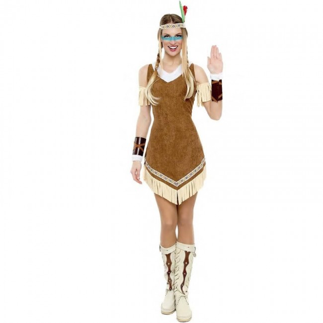 El disfraz de india mohicana para mujer incluye vestido, brazaletes, muñequeras y cinta de la cabeza con plumas. Hazte un hueco en la tribu con este disfraz de india mohicana.