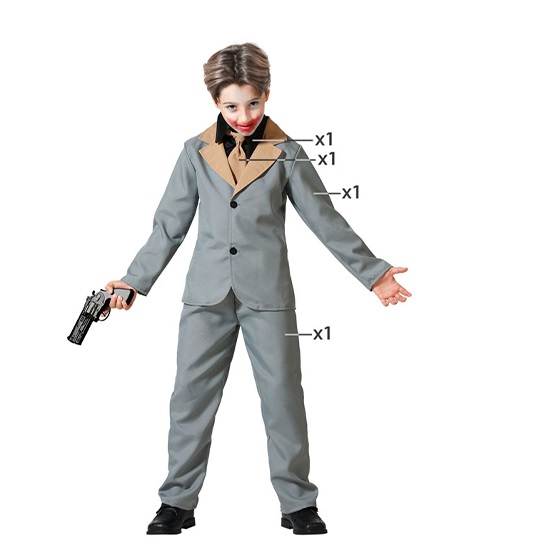 El disfraz de jóker gris para niño incluye pantalón, chaqueta, corbata y cuello de camisa. Disfraz de Joker Gris para niño para carnaval y fiestas infantiles.