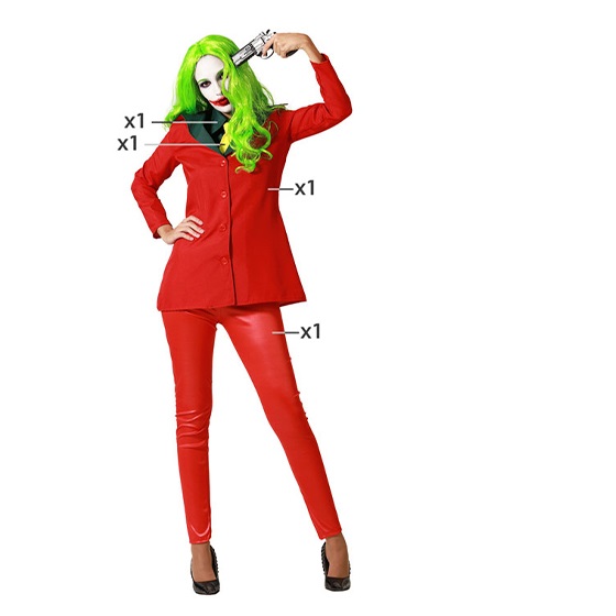 El disfrazde jóker rojo para mujer incluye pantalón, chaqueta, cuello camisa y pajarita. Este modelo de Jóker en color rojo para mujer te convertirá en tu supervillano favorito en versión femenina de la forma más elegante.