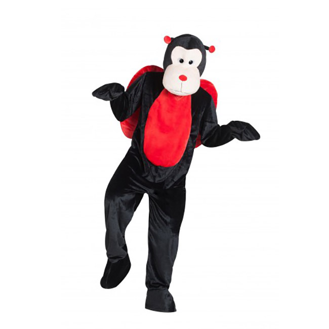 El disfraz de mariquita mascota para adulto incluye mono, manoplas, alas y cabeza.