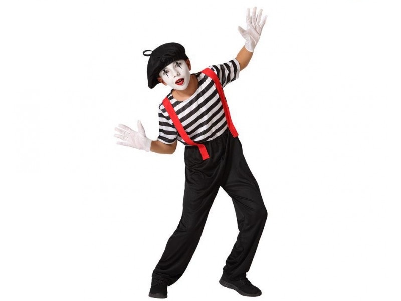 El disfraz de mimo para niño incluye boina, camiseta y pantalón. Demuestra que, con tu disfraz de mimo para infantil, eres capaz de expresar tantas emociones como con las palabras.