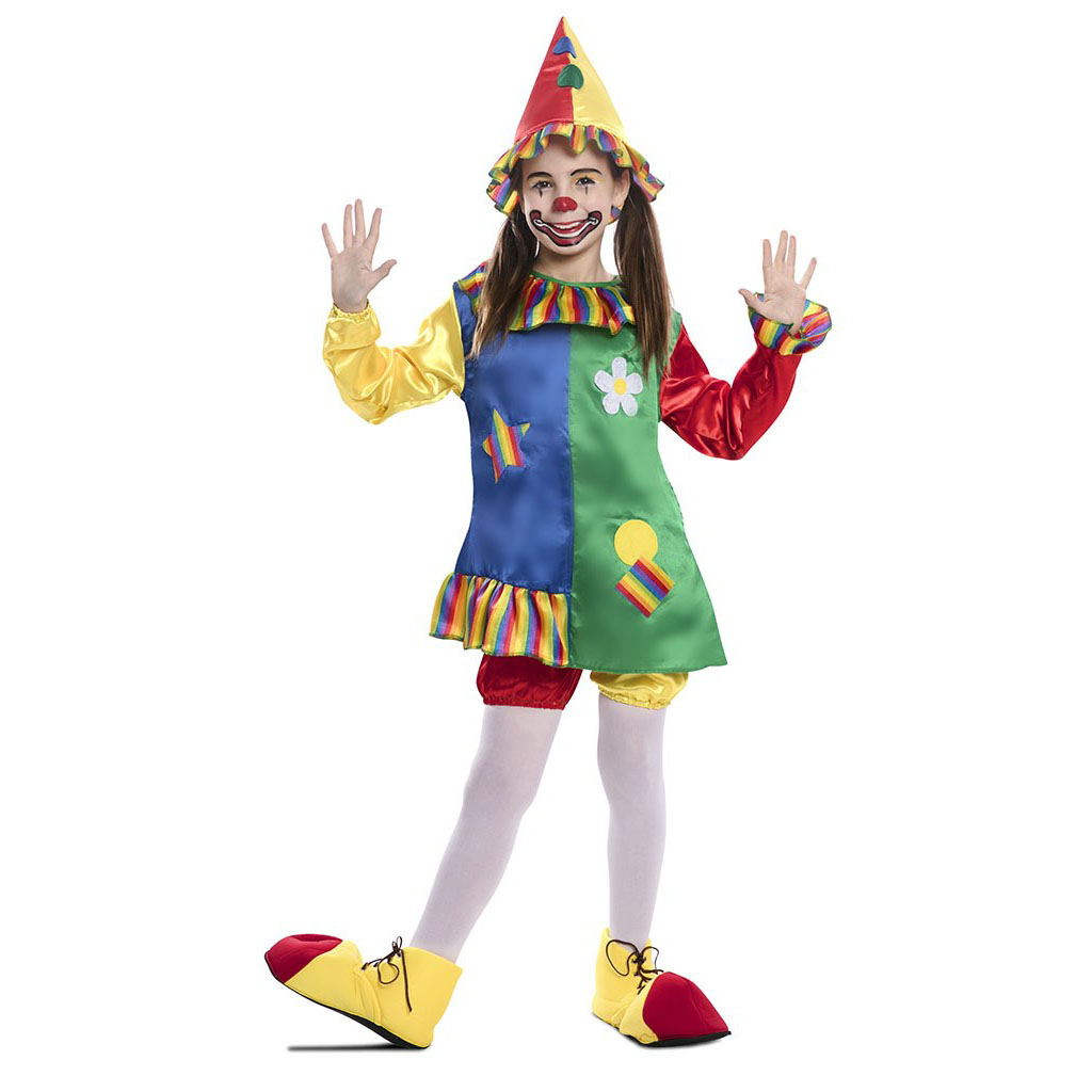 El disfraz de payasita multicolor para niña incluye : Camisa, pololos, sombrero. Disfraz de payaso para niñas en Carnaval o fiestas de temática circo.