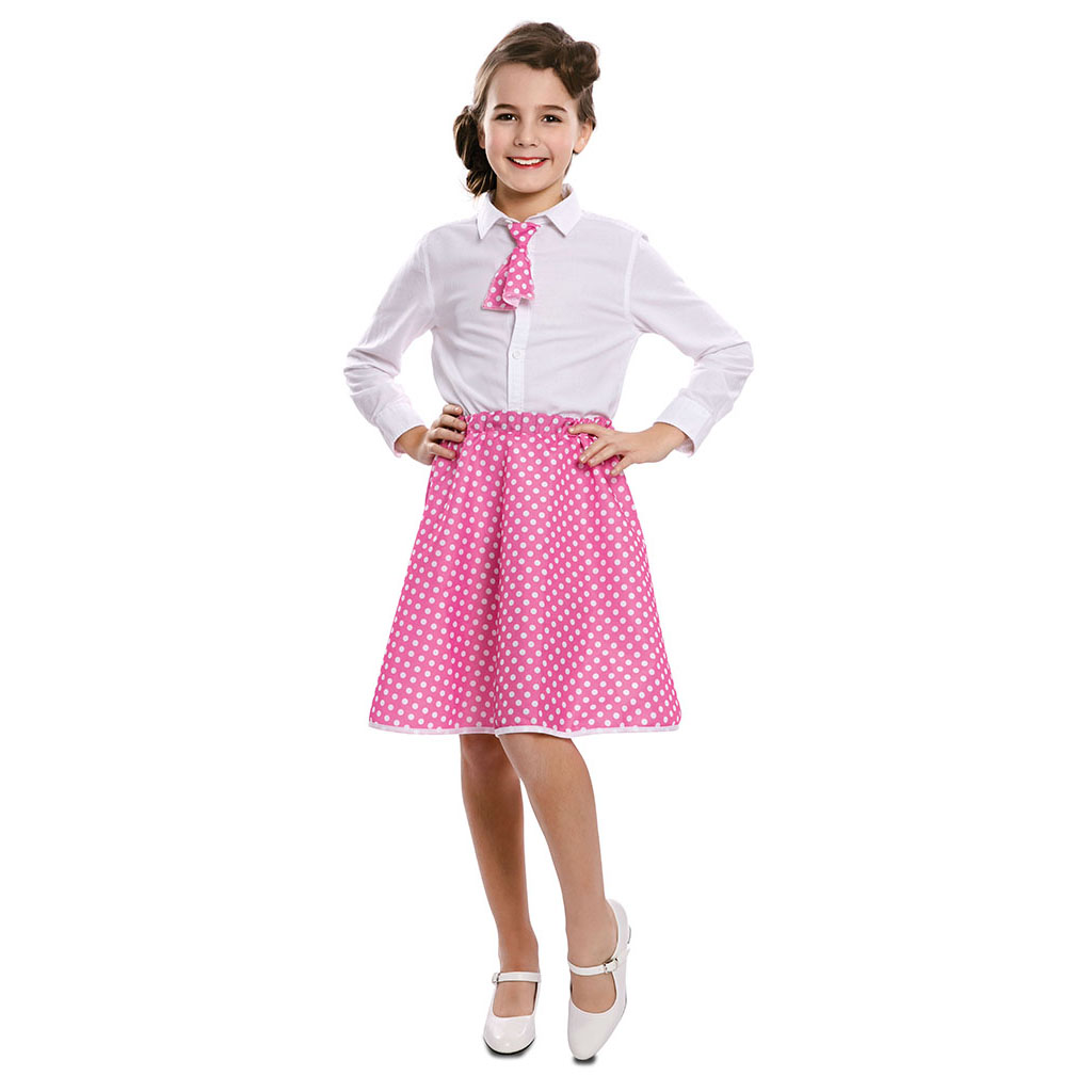 El disfraz de pin-up rosa para niña incluye : Falda, corbata.  Con la falda rosa años 50 con lunares y pañuelo para niña tendrás el complemento perfecto para disfrazar a tu hija con la moda de la maravillosa década de los 50, y será la niña más guapa de la fiesta de disfraces.