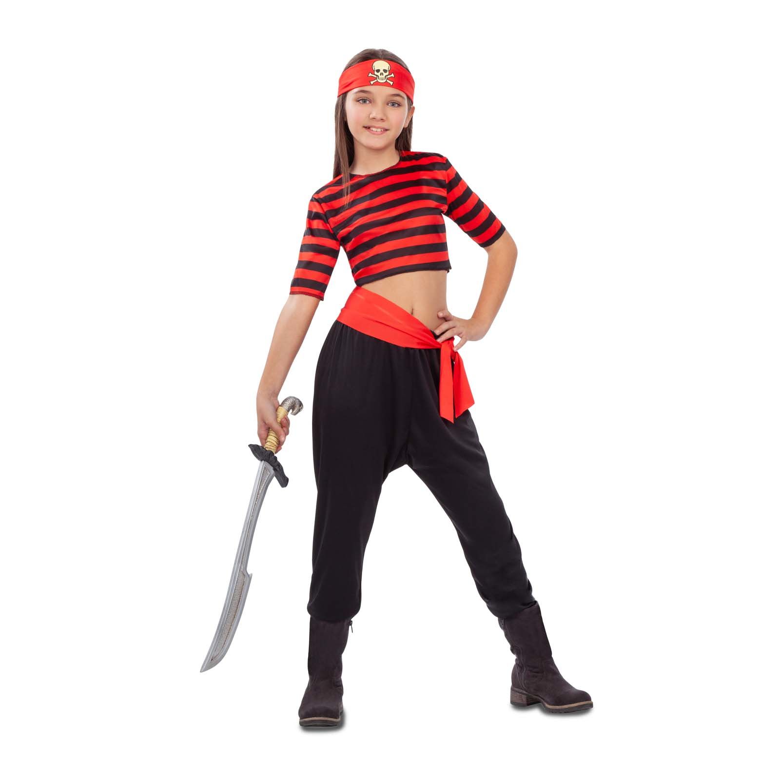 El disfraz de pirata rayas para niña incluye pañuelo, top, fajín y pantalón. Disfruta del mundo pirata con este Disfraz de Pirata de Rayas para Niña.