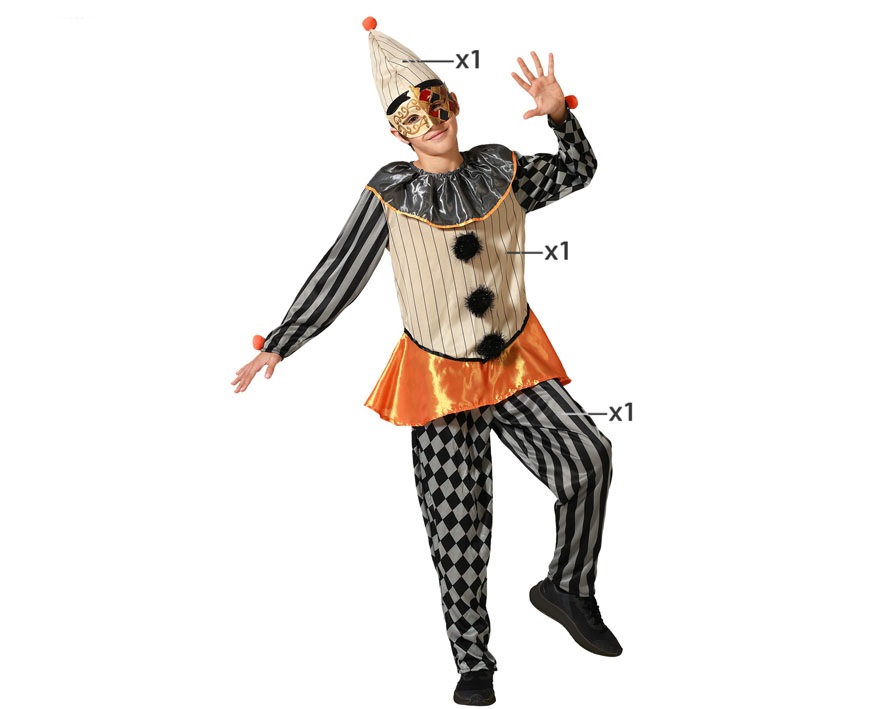 El disfraz de polichinela infantil incluye bonete, camiseta manga larga y pantalón largo. Nos remontamos años atrás en la antigua Italia dónde empezaron las bellas artes del canto y la interpretación. En una época marcada por las representaciones teatrales protagonizadas por personajes extravagantes ocultos tras máscaras o vestidos con originales y divertidas prendas.