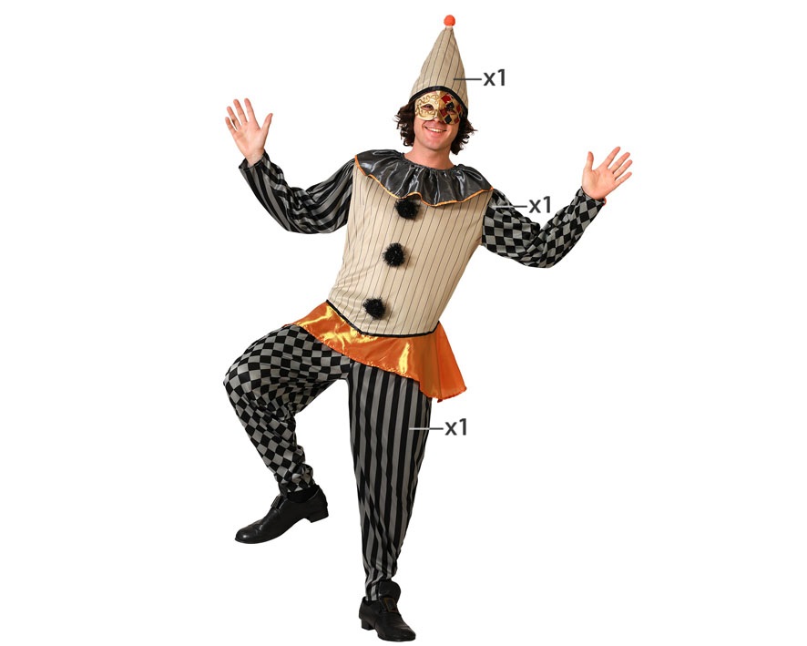 El disfraz de polichinela unisex incluye bonete, camiseta manga larga y pantalón largo. Nos remontamos años atrás en la antigua Italia dónde empezaron las bellas artes del canto y la interpretación. En una época marcada por las representaciones teatrales protagonizadas por personajes extravagantes ocultos tras máscaras o vestidos con originales y divertidas prendas.