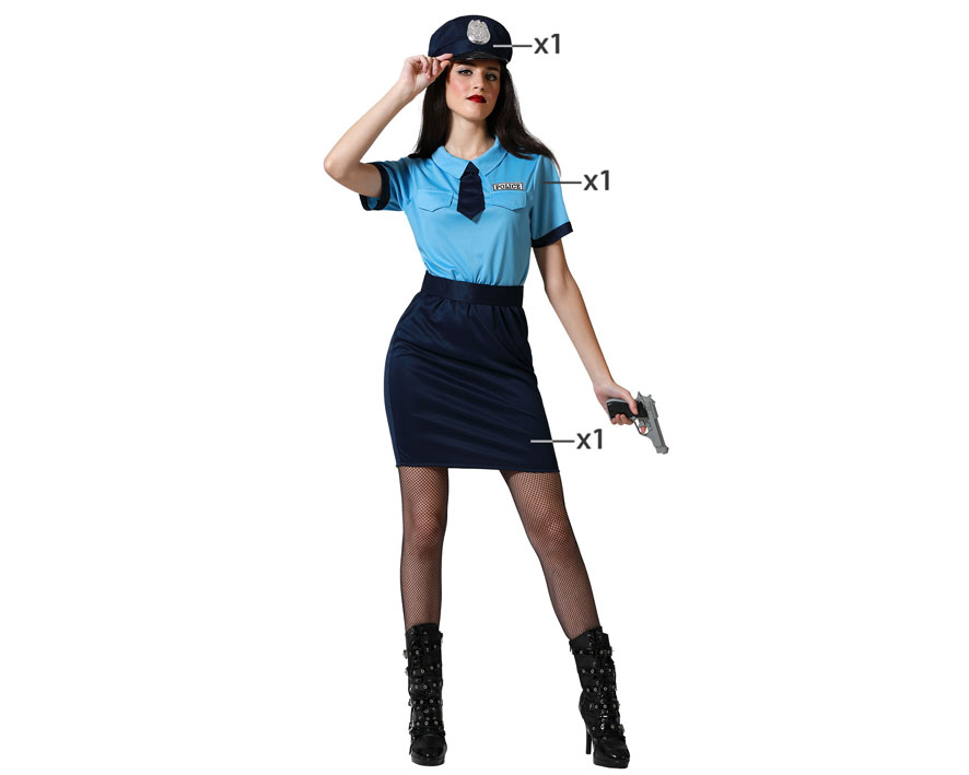 El disfraz de policia para mujer incluye gorra de policía, camiseta y falda. No incluye medias, botas ni arma. Disfraz de Policía Local para mujer para carnaval y fiestas temáticas.