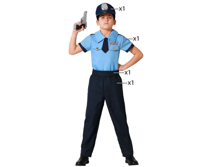 El disfraz de policia para niño incluye 1 camiseta, 1 pantalón, 1 cinturón y 1 gorra. Disfraz de Policía Básico para niño para carnaval y fiestas temáticas. Elige una profesión, compra tu disfraz y disfruta entre amigos.