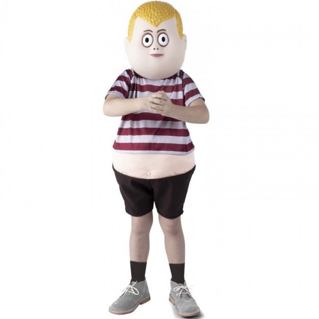 El disfraz de Pugsley Addams para hombre incluye pantalón con barriga, camiseta y máscara . Este traje de hombre imitando a un hijo de Gomez y Morticia Addams.