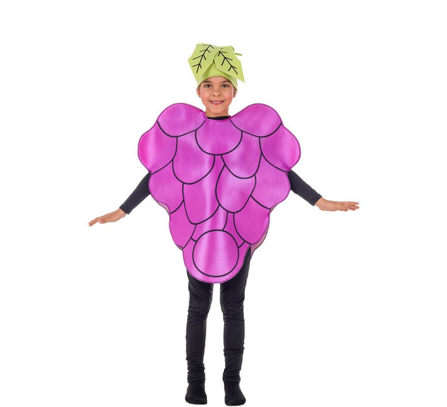 El disfraz de racimo de uva infantil incluye cuerpo y gorro. Los disfraces de frutas son siempre muy divertidos en cualquier fiesta y fáciles de combinar.