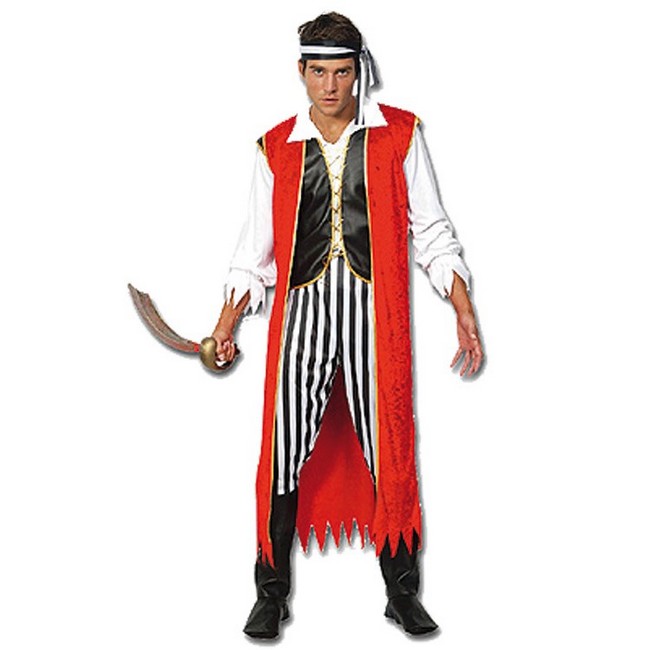 El disfraz de rey pirata para hombre incluye camisa, pantalón, cinta para el pelo, bata y cubrebotas. Combina este modelo de pirata con el de mujer y el de los niños para convertiros en una fantástica familia pirata y ¡surca los 7 mares!