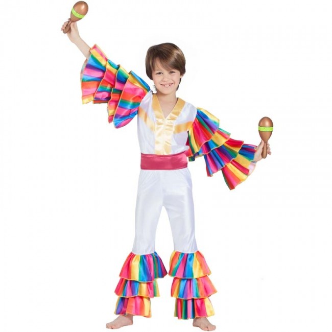 El disfraz de rumbero cubano para niño incluye camisa con volantes, pantalón con volantes y fajín. Es un disfraz muy colorido y divertido con el que podrás bailar Merengue, bachata, salsa o rumba. Es perfecto para Funciones Escolares, Carnaval o Fiestas Temáticas.