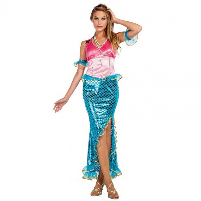 El disfraz de sirena incluye vestido y brazaletes. Sexy con escamas y aleta estarás con este disfraz de encantos de sirena.
