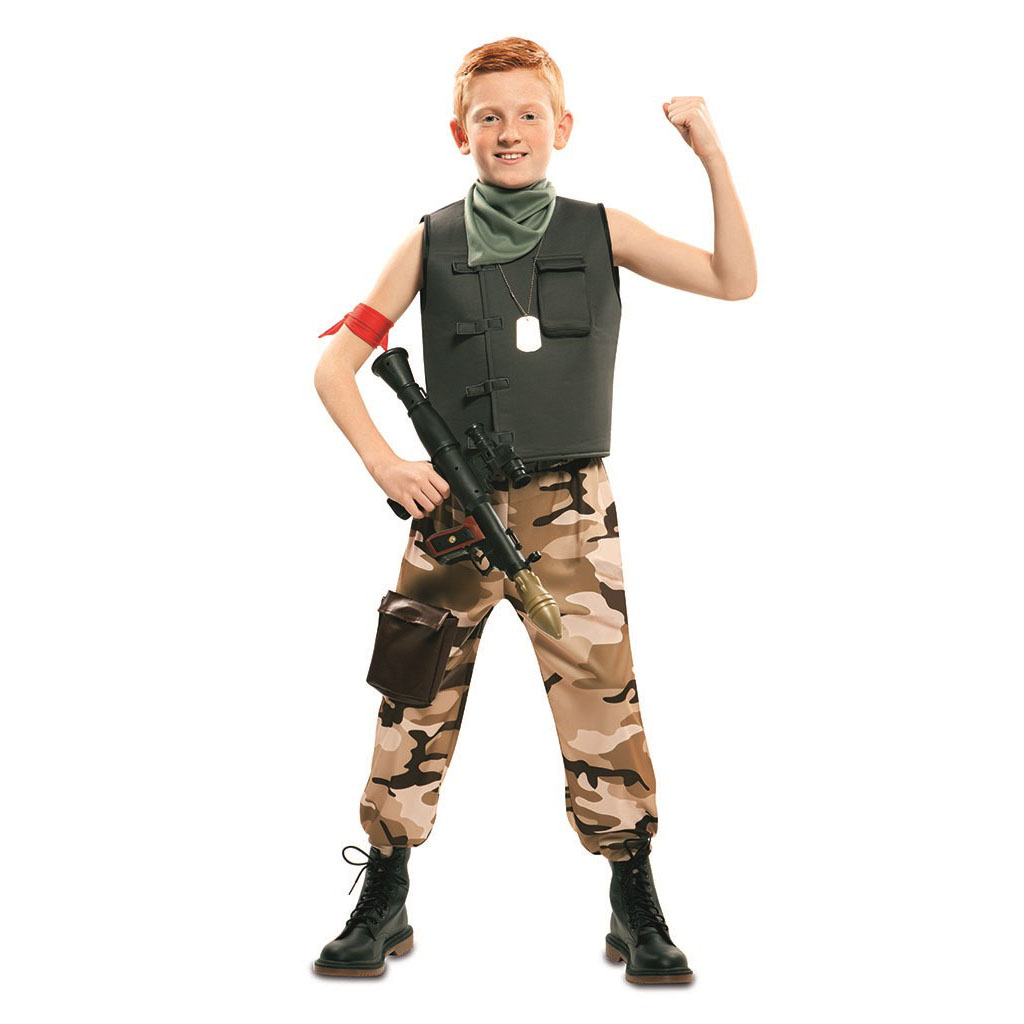 El disfraz de soldado de combate para niño incluye : Chaleco, pantalón, pañuelo, cinturón, cinta roja. Disfraz de Soldado de niño para carnaval. Elige el disfraz personaje de dibujos o cuentos para vivir tu historia favorita o para los festivales escolares infantiles.