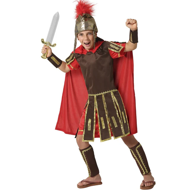 Disfraz talla infantil niño ideal para Carnaval. Cotenido del pack: un casco, dos muñequeras, dos espinilleras, una capa y una túnica. ¡Ave Cesar! Este disfraz para niños es un completo uniforme de legionario romano de talla infantil perfecto para un gran disfraz de Carnaval, una representación para navidad o fiestas como la de Carthagineses y Romanos. Nuestro traje tiene el aspecto de haber sido confeccionado en la antigua Roma para gloria de los ejércitos del César así que no te compliques con un disfraz romano casero y quédate con un uniforme auténticamente romano. Este genial conjunto se compone de una capa roja, una túnica marrón, un casco, dos muñequeras y dos espinilleras. Ten en cuenta que la espada y las sandalias no están incluidas, aunque podrás encontrarlas en nuestra tienda de accesorios.