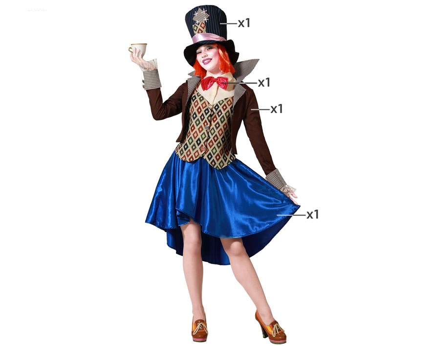 El disfraz de sombrerera loca para mujer incluye sombrero de copa, pajarita, chaleco, chaqueta y falda. Precioso y completo disfraz de sombrerera con el que revivir el cuento de Alicia en el País de las Maravillas.