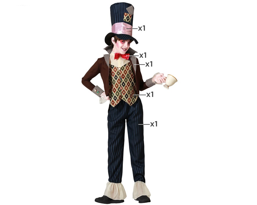 El disfraz de sombrerero loco para niño incluye sombrero de copa, pajarita, chaqueta, chaleco y pantalón largo. Con un vestuario muy divertido y colorido te proponemos este modelo de sombrerero loco para niño.
