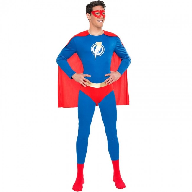 El disfraz de superhéroe relámpago para hombre incluye mono, calzones con cinturón, capa y antifaz. Un vistoso y original traje de Superhéroe relámpago para fiestas y eventos.