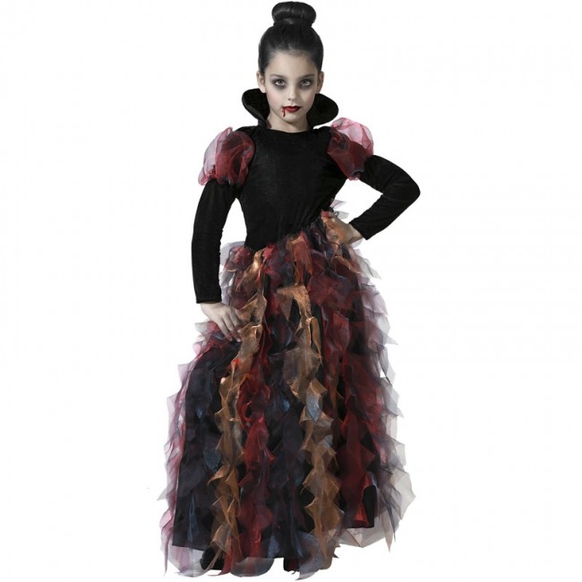 El disfraz de vampiresa con arapos para niña incluye vestido cuello alto manga larga.
