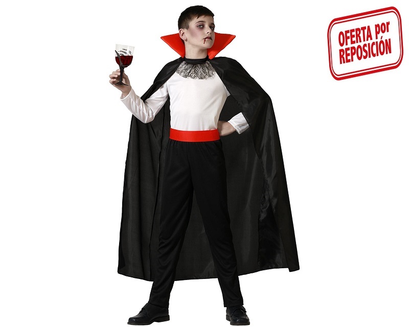 El disfraz de vampiro para niño incluye capa con cuello alto, camiseta manga larga, cinturón y pantalón.